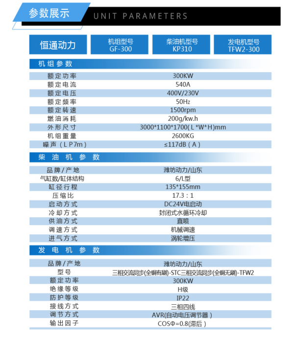 這里以基礎(chǔ)的300KW發(fā)電機(jī)組為示例跟大家展示一下發(fā)電機(jī)組的參數(shù),具體到其他型號(hào)的參數(shù)還需大家去聯(lián)系我司的業(yè)務(wù)人員,由他們出具一份具體的參數(shù)表。