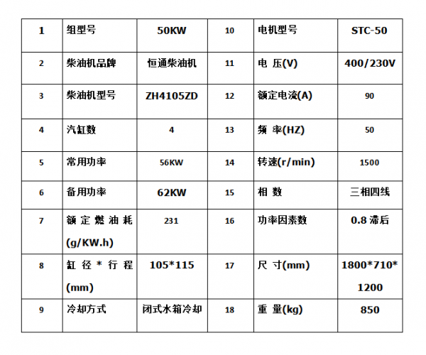 二、 康明斯柴油發(fā)電機(jī)50kw技術(shù)參數(shù):