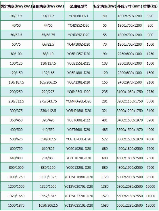 二、玉柴柴油發(fā)電機組主要規(guī)格型號及技術參數(shù):